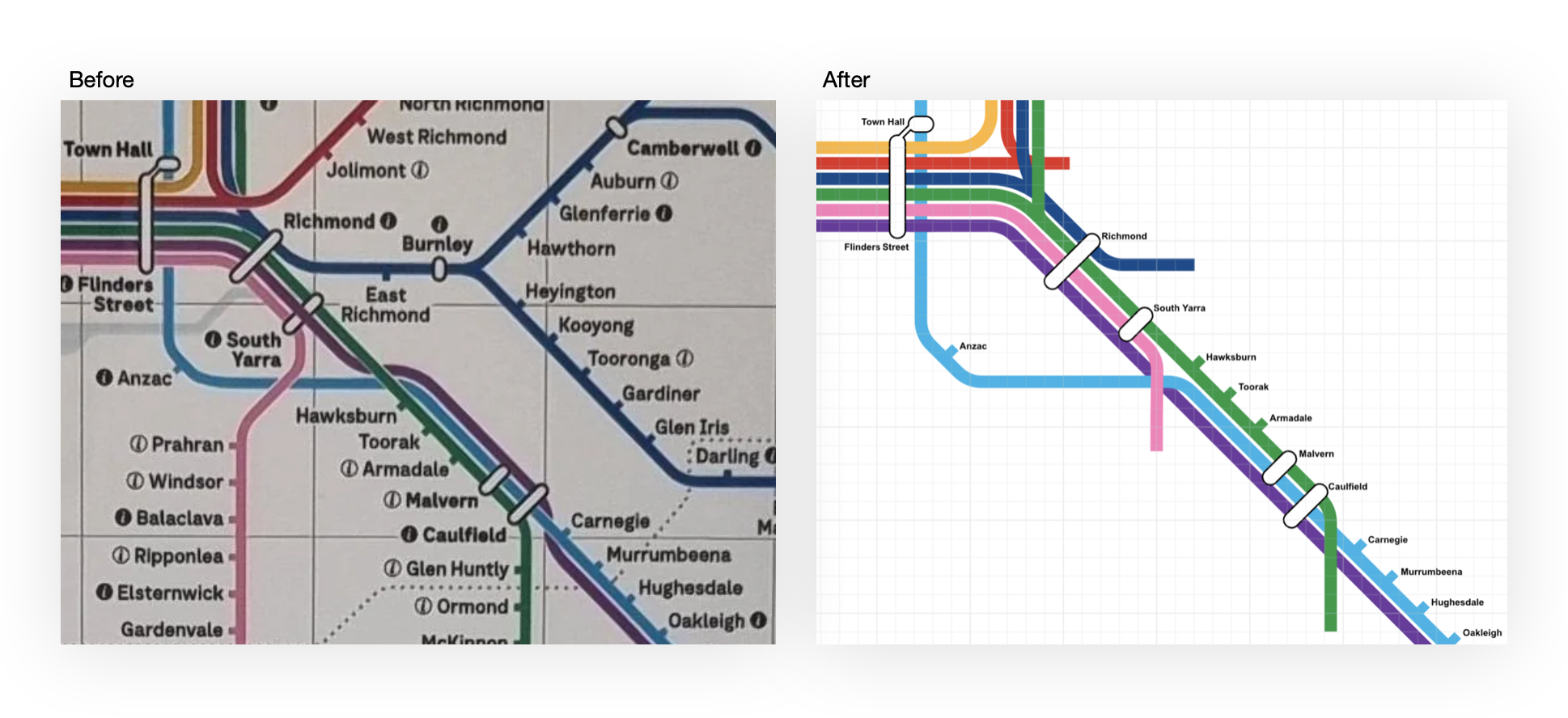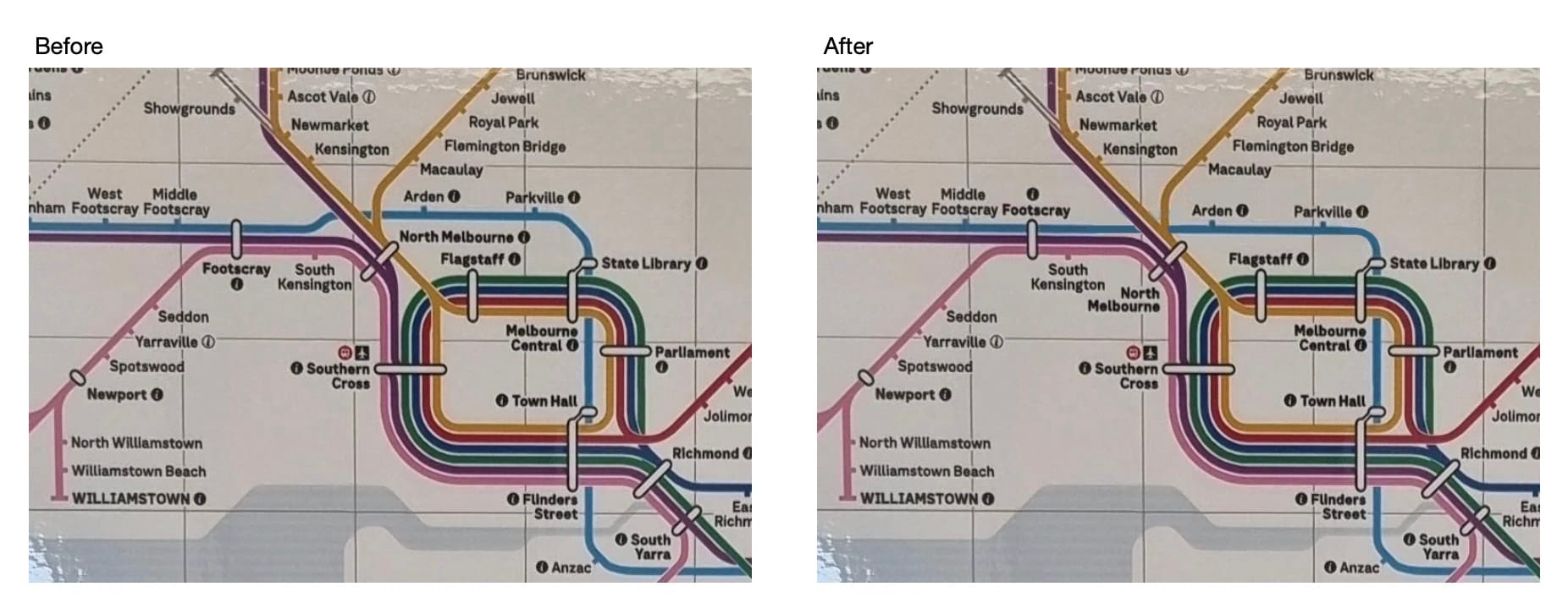 - The kink in the Metro Tunnel line between Footscray and Arden. I understand maps all have compromises, but having a kink here just isn't necessary.