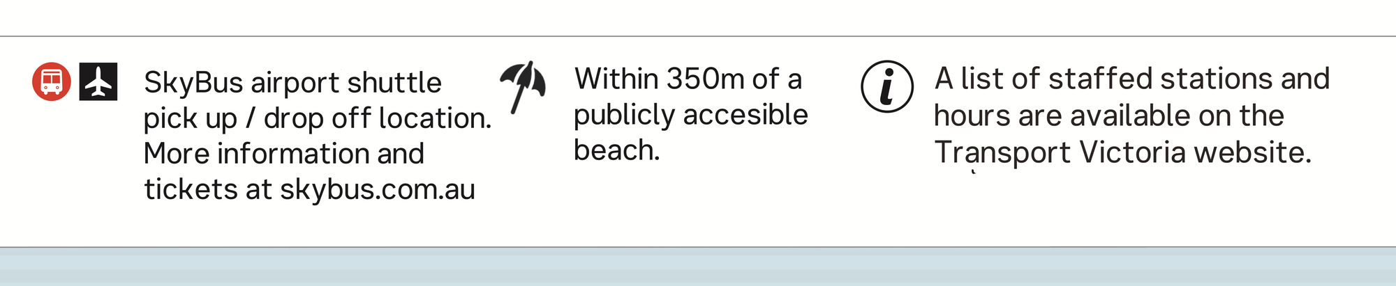 Luckily Melbourne stations all have (often non-compliant) ramps, except one station which is noted. But all of these are just as, or more important, than a customer service desk being open or not.