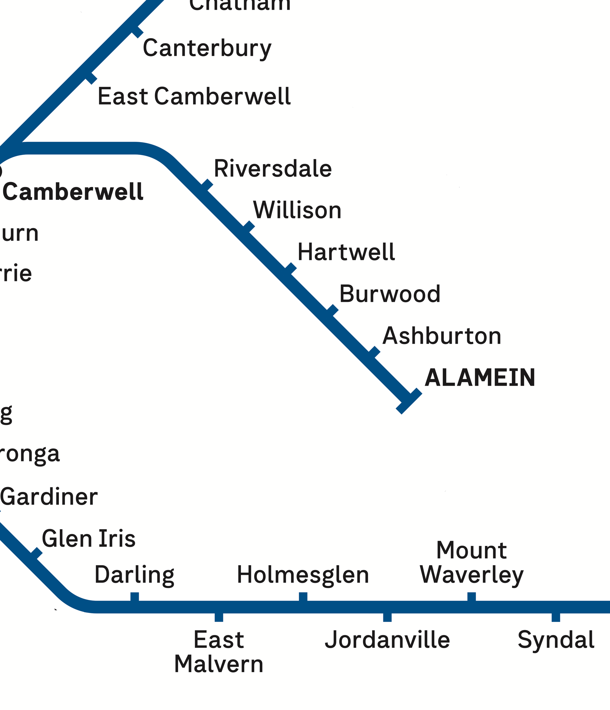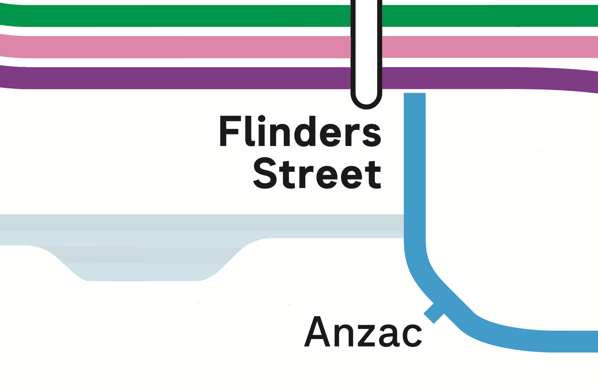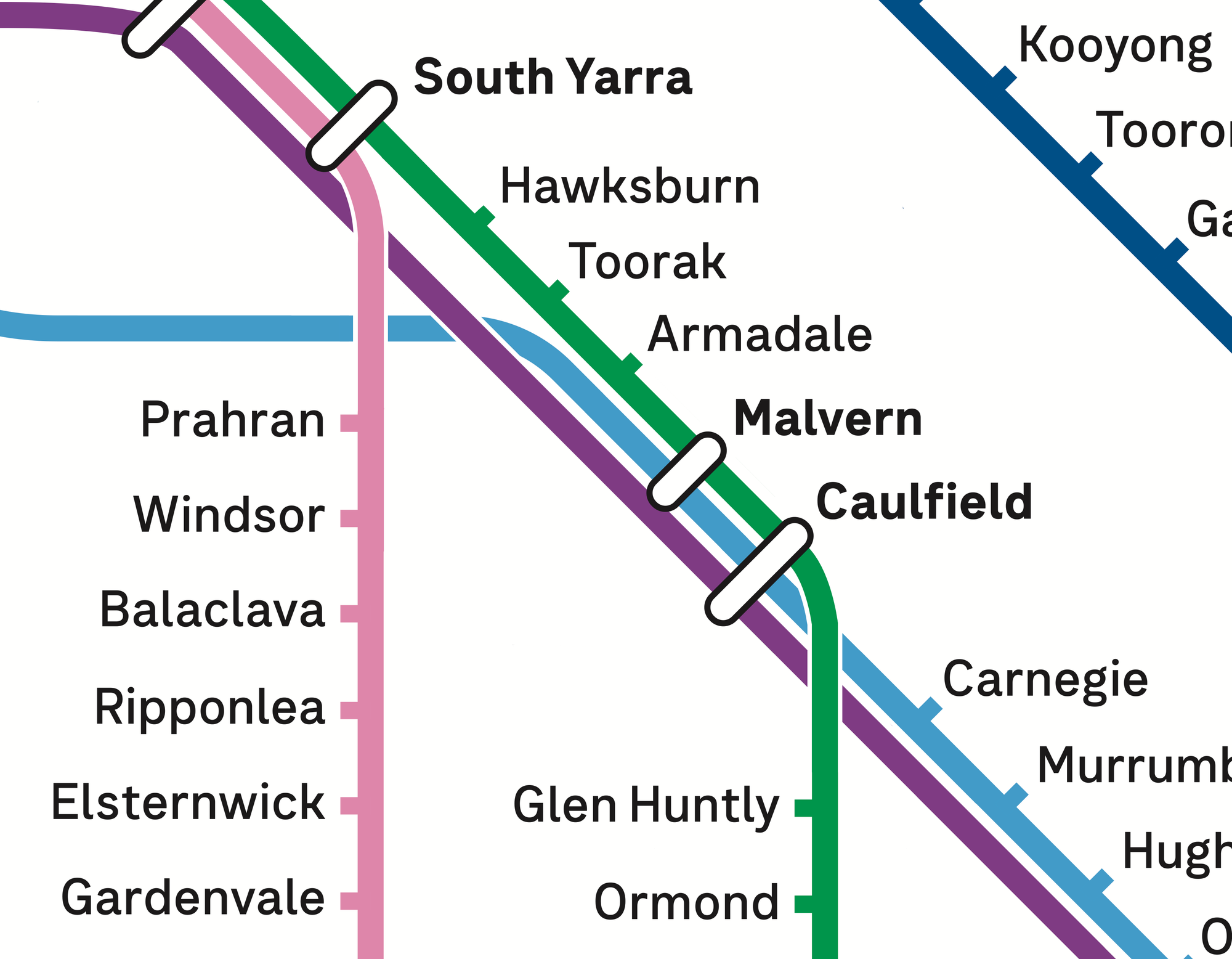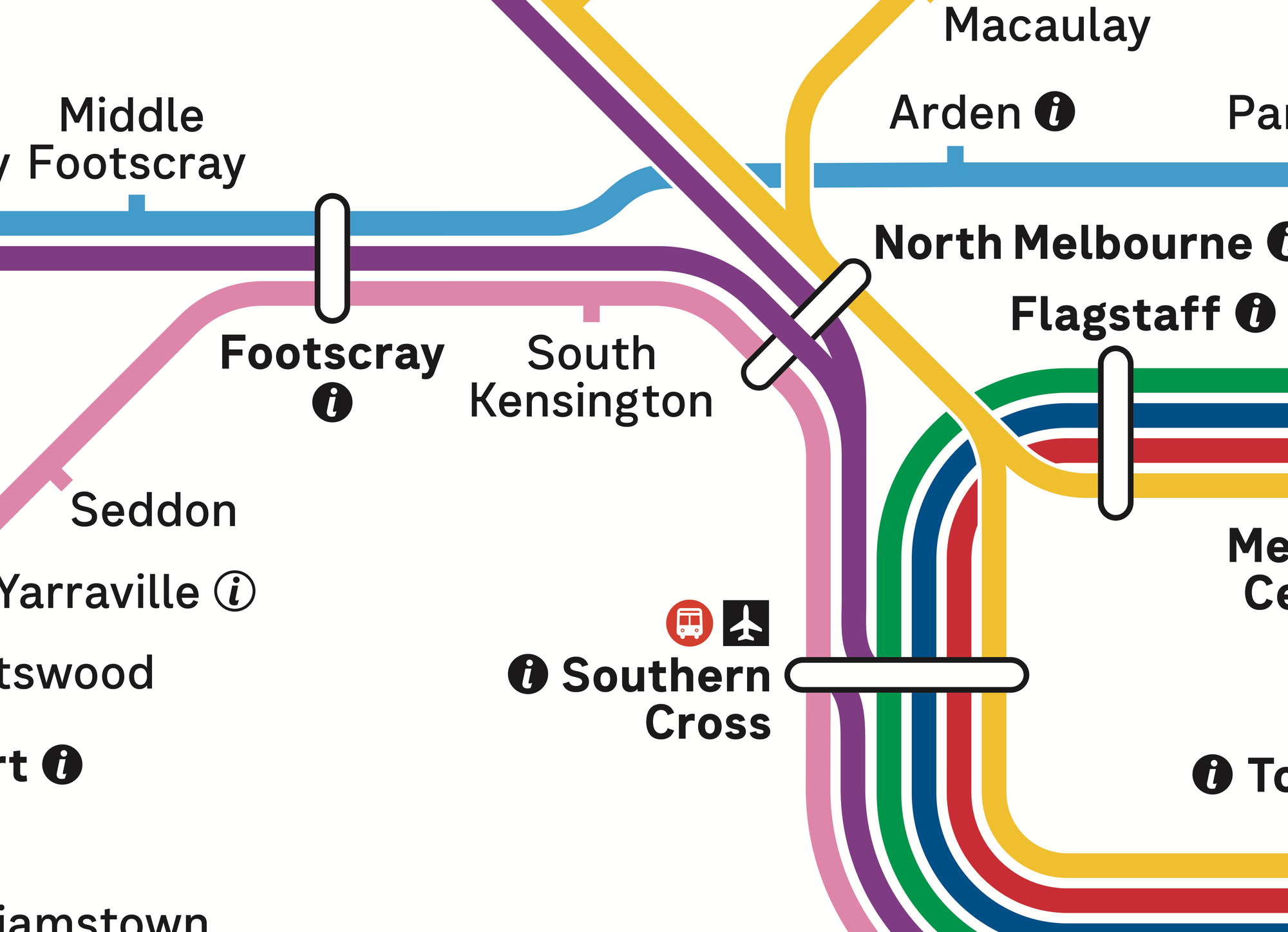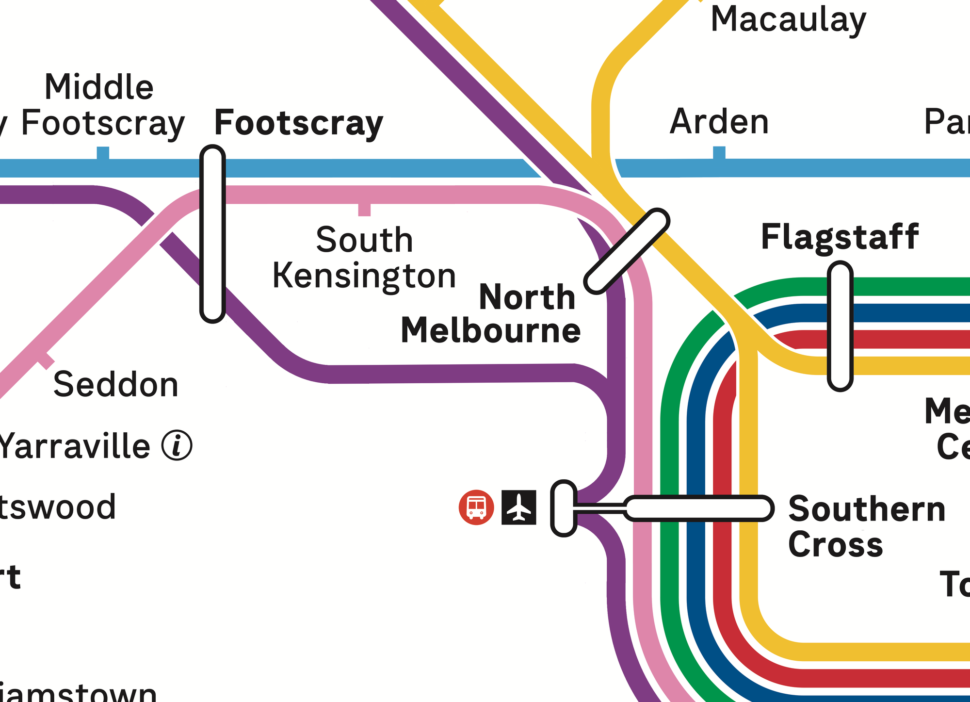 However the actual track does run right past the stations. So the proposed layout chooses clarity of journey over physical representation. It also avoids the aforementioned station-skipping line-over-lozenge at North Melbourne.