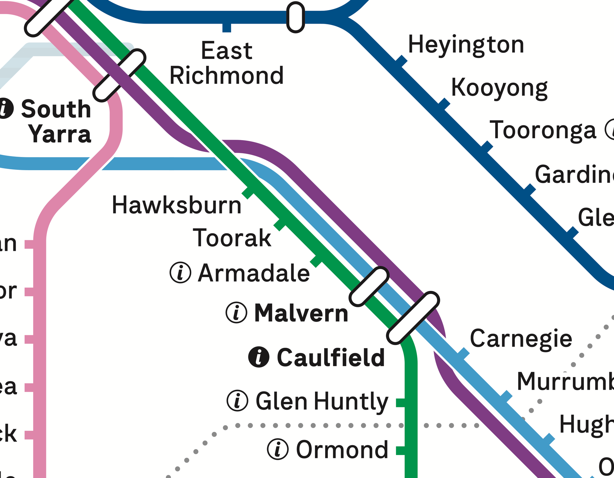 At South Yarra, the purple V/Line service can be seen displayed over the top of the station interchange lozenge, to indicate that trains from Gippsland don't stop there.