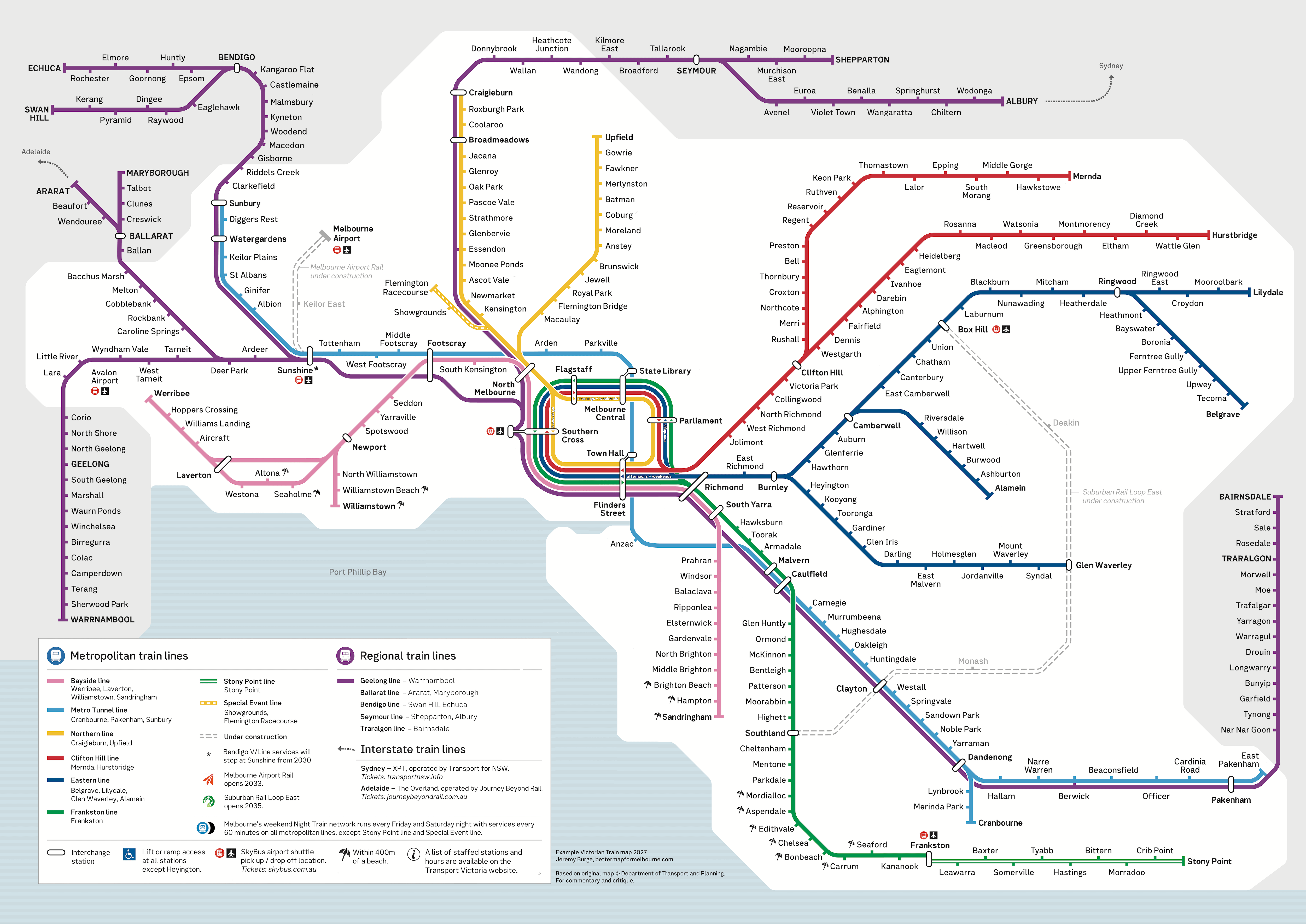 I would also suggest V/Line services also stop at South Yarra, now they will pass a now-empty set of platforms, vacated by Cranbourne/Pakenham trains using the Metro tunnel instead. However that's not shown on this map, as there are no public plans to do so.