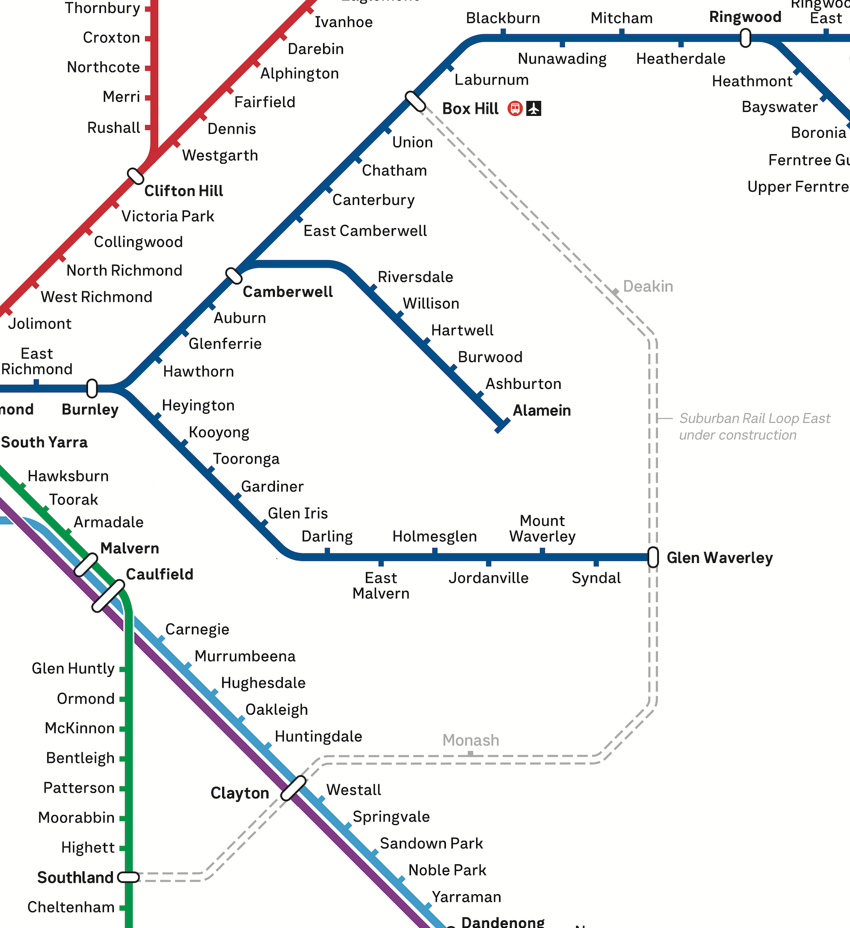 This is a clean version of Suburban Rail Loop East which makes assumptions about station names, not yet final as of early 2026. "Monash" for the station at Monash University, and "Deakin" for the station opposite Deakin University.